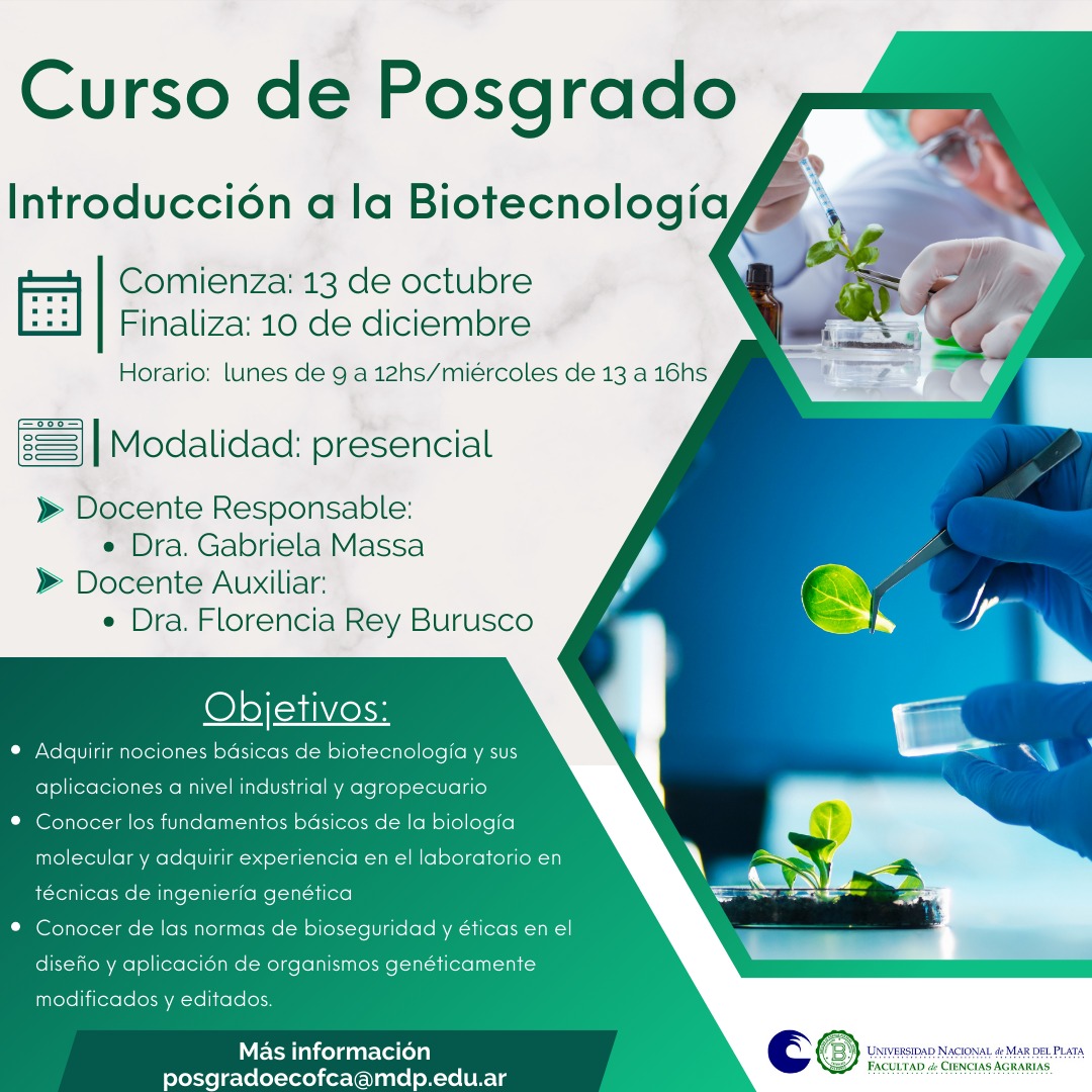 Comienza: 13 de octubre Finaliza: 10 de diciembre Horario: lunes de 9 a 12hs/miércoles de 13 a 16hs Modalidad: presencial Docente Responsable: Auxiliar: Objetivos: Más información posgradoecofca@mdp.edu.ar